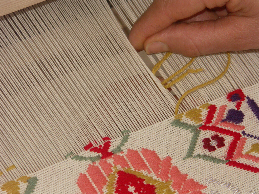 La tessitura è la forma di artigianato che, come in molti altri centri del circondario, più di ogni altra rappresenta la tradizione artigianale locale. La storia della tessitura, cosi come della panificazione, affonda le sue radici nella leggenda e nella storia più antica. Si narra di una donna bellissima, Luxia, che abitava nella località chiamata Prabanta e che attendeva il ritorno dei suoi figli tessendo su un telaio d’oro all’interno del nuraghe Santu Miali. In ogni casa, fino al secolo scorso, era presente un telaio dove le donne tessevano tutto ciò che serviva per la casa, per il proprio corredo e successivamente per essere venduto. Copriletti a pibiones, tappeti a froccus, arazzi, asciugamani e altro venivano confezionati dalle mani sapienti delle donne di Pompu e questa tradizione non si è persa. Resta ancora come ultimo baluardo di un sapere antico che si tramanda di madre in figlia seppur con le difficoltà di farne un lavoro vero.